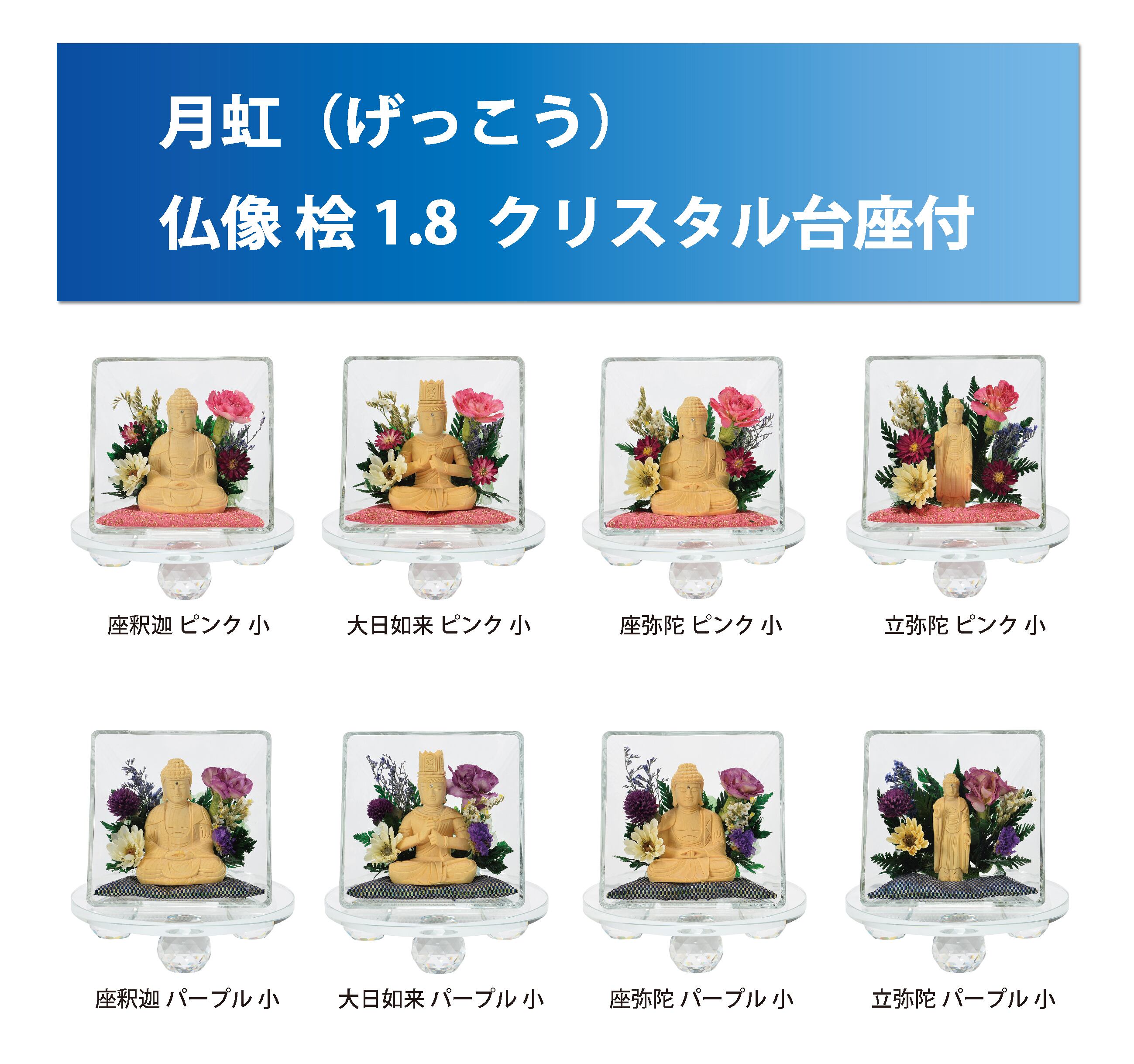 【 月虹(げっこう)仏像 桧1.8 クリスタル台座付 】ご本尊 座釈迦・大日如来・座弥陀・立弥陀 全2種(ピンク・パープル)